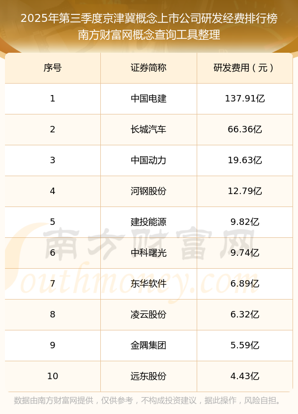 2025年第三季度,京津冀概念上市公司研發(fā)經(jīng)費(fèi)排行榜中,中國(guó)電建(601669)研發(fā)經(jīng)費(fèi)總額高達(dá)137.91億,長(zhǎng)城汽車(601633)和中國(guó)動(dòng)力(600482)排名第二和第三,河鋼股份(000709)、建投能源(000600)、中科曙光(603019)、東華軟件(002065)、凌云股份(600480)、金隅集團(tuán)(601992)、遠(yuǎn)東股份(600869)進(jìn)入前十,研發(fā)經(jīng)費(fèi)總額分別排名第4-10名。