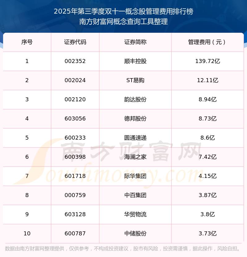 2025年第三季度,雙十一概念股管理費(fèi)用排名中,順豐控股(002352)的管理費(fèi)用總額高達(dá)139.72億,ST易購(gòu)(002024)和韻達(dá)股份(002120)排名第二和第三,德邦股份(603056)、圓通速遞(600233)、海瀾之家(600398)、際華集團(tuán)(601718)、中百集團(tuán)(000759)、華貿(mào)物流(603128)、中儲(chǔ)股份(600787)進(jìn)入前十,其管理費(fèi)用總額分別排名第4-10名。