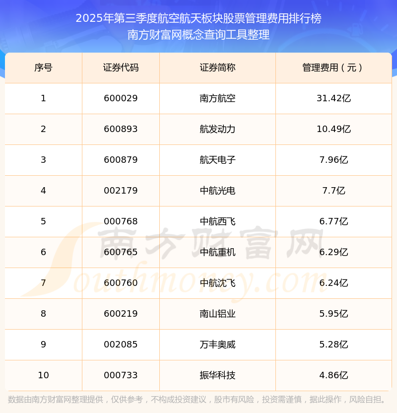 2025年第三季度,航空航天板塊股票管理費用排名如下:南方航空(600029)的管理費用總額高達31.42億,航發動力(600893)和航天電子(600879)位居第二和第三,中航光電(002179)、中航西飛(000768)、中航重機(600765)、中航沈飛(600760)、南山鋁業(600219)、萬豐奧威(002085)、振華科技(000733)分別進入前十,其管理費用總額分別排名第4-10名。