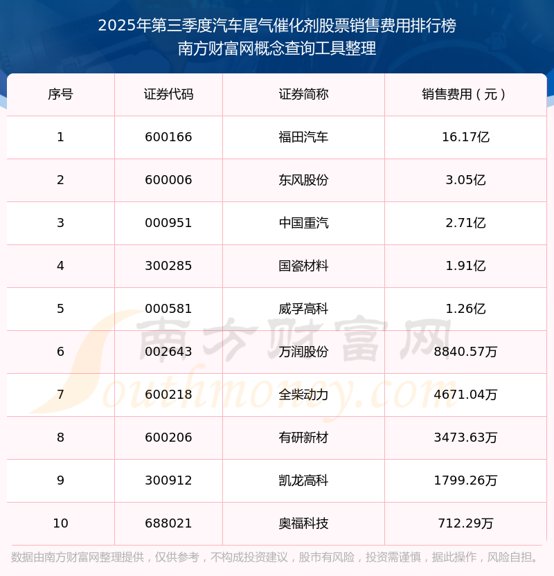 2025年第三季度汽車尾氣催化劑股票銷售費(fèi)用排行榜如下:福田汽車(600166)的銷售費(fèi)用總額高達(dá)16.17億,東風(fēng)股份(600006)和中國(guó)重汽(000951)分別位居第二和第三,國(guó)瓷材料(300285)、威孚高科(000581)、萬潤(rùn)股份(002643)、全柴動(dòng)力(600218)、有研新材(600206)、凱龍高科(300912)、奧福科技(688021)分別進(jìn)入前十,其銷售費(fèi)用總額分別排名第4-10名。