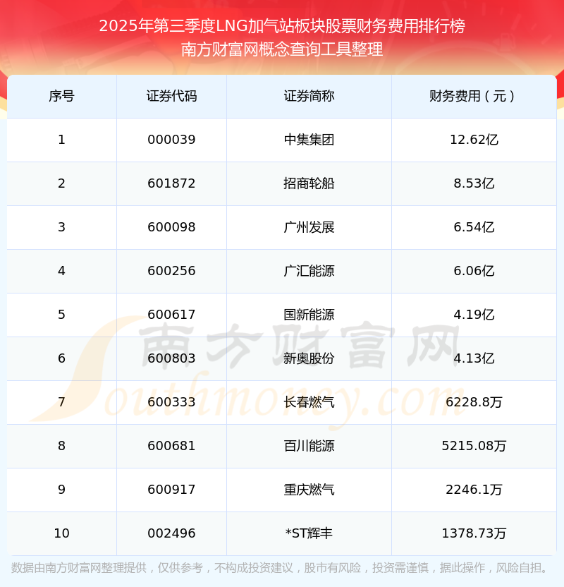 2025年第三季度,LNG加氣站板塊股票財務(wù)費用排行榜中,中集集團(tuán)(000039)財務(wù)費用總額高達(dá)12.62億,招商輪船(601872)和廣州發(fā)展(600098)位居第二和第三,廣匯能源(600256)、國新能源(600617)、新奧股份(600803)、長春燃?xì)猓?00333)、百川能源(600681)、重慶燃?xì)猓?00917)、*ST輝豐(002496)進(jìn)入前十,財務(wù)費用總額分別排名第4-10名。