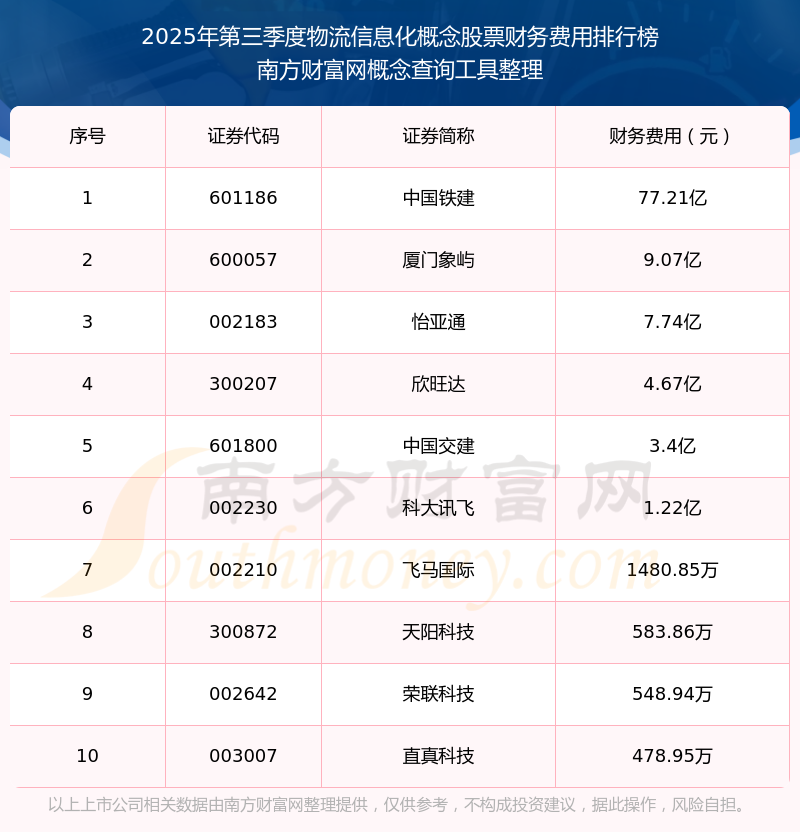 物流信息化概念股票10強:2025年第三季度財務費用排名