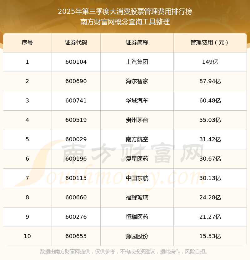 2025年第三季度,大消費股票管理費用排名如下:上汽集團(600104)的管理費用總額高達149億,海爾智家(600690)和華域汽車(600741)位居第二和第三,貴州茅臺(600519)、南方航空(600029)、復星醫藥(600196)、中國東航(600115)、福耀玻璃(600660)、恒瑞醫藥(600276)、豫園股份(600655)分別進入前十,其管理費用總額分別排名第4-10名。