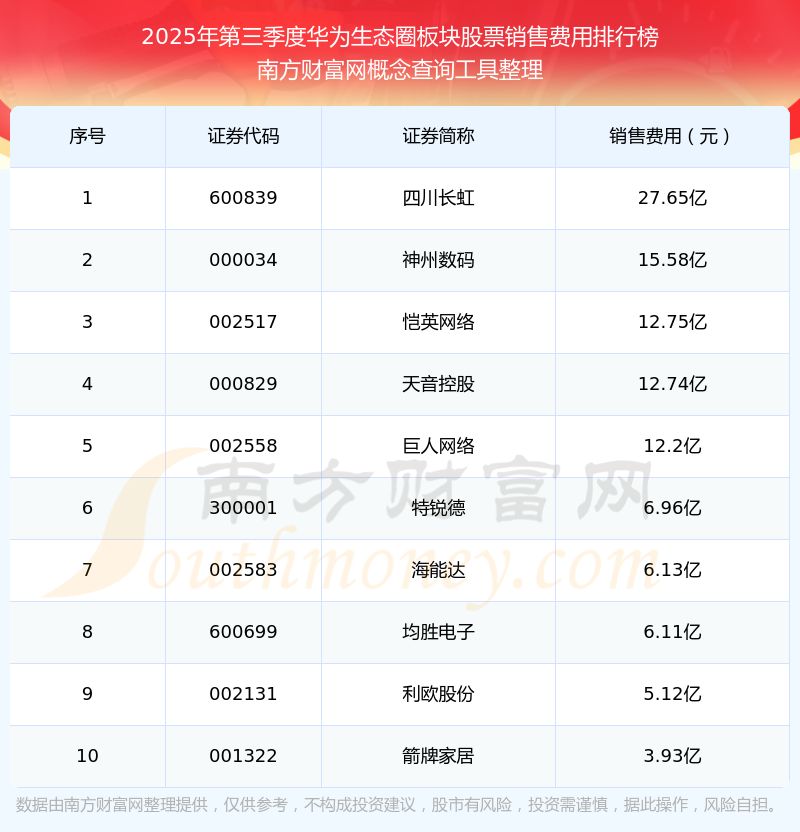2025年第三季度,華為生態(tài)圈板塊股票銷售費(fèi)用排行榜如下:四川長(zhǎng)虹(600839)的銷售費(fèi)用總額高達(dá)27.65億,神州數(shù)碼(000034)和愷英網(wǎng)絡(luò)(002517)分別位居第二和第三,天音控股(000829)、巨人網(wǎng)絡(luò)(002558)、特銳德(300001)、海能達(dá)(002583)、均勝電子(600699)、利歐股份(002131)、箭牌家居(001322)分別進(jìn)入前十,其銷售費(fèi)用總額分別排名第4-10名。