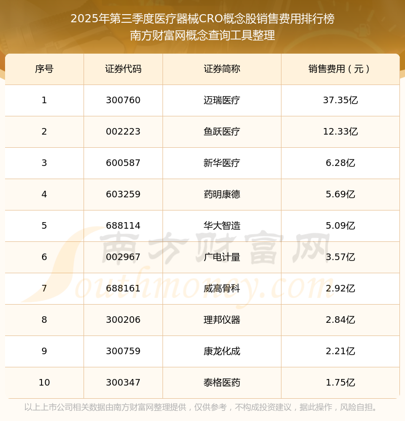 醫療器械CRO概念股銷售費用榜單(2025年第三季度前十名單)