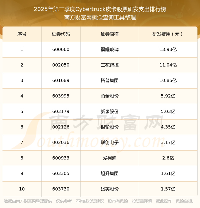2025年第三季度,Cybertruck皮卡股票研發支出排名如下:福耀玻璃(600660)研發支出總額高達13.93億,三花智控(002050)和拓普集團(601689)分別位居第二和第三,甬金股份(603995)、新泉股份(603179)、銀輪股份(002126)、聯創電子(002036)、愛柯迪(600933)、旭升集團(603305)、岱美股份(603730)分別進入前十,其研發支出總額分別排名第4-10名。