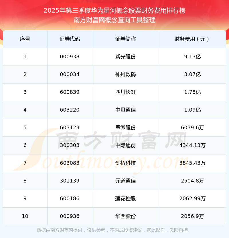 2025年第三季度,華為星河概念股票財務費用排行榜中,紫光股份(000938)財務費用總額高達9.13億,神州數碼(000034)和四川長虹(600839)位居第二和第三,中貝通信(603220)、翠微股份(603123)、中際旭創(300308)、劍橋科技(603083)、元道通信(301139)、蓮花控股(600186)、華西股份(000936)進入前十,財務費用總額分別排名第4-10名。