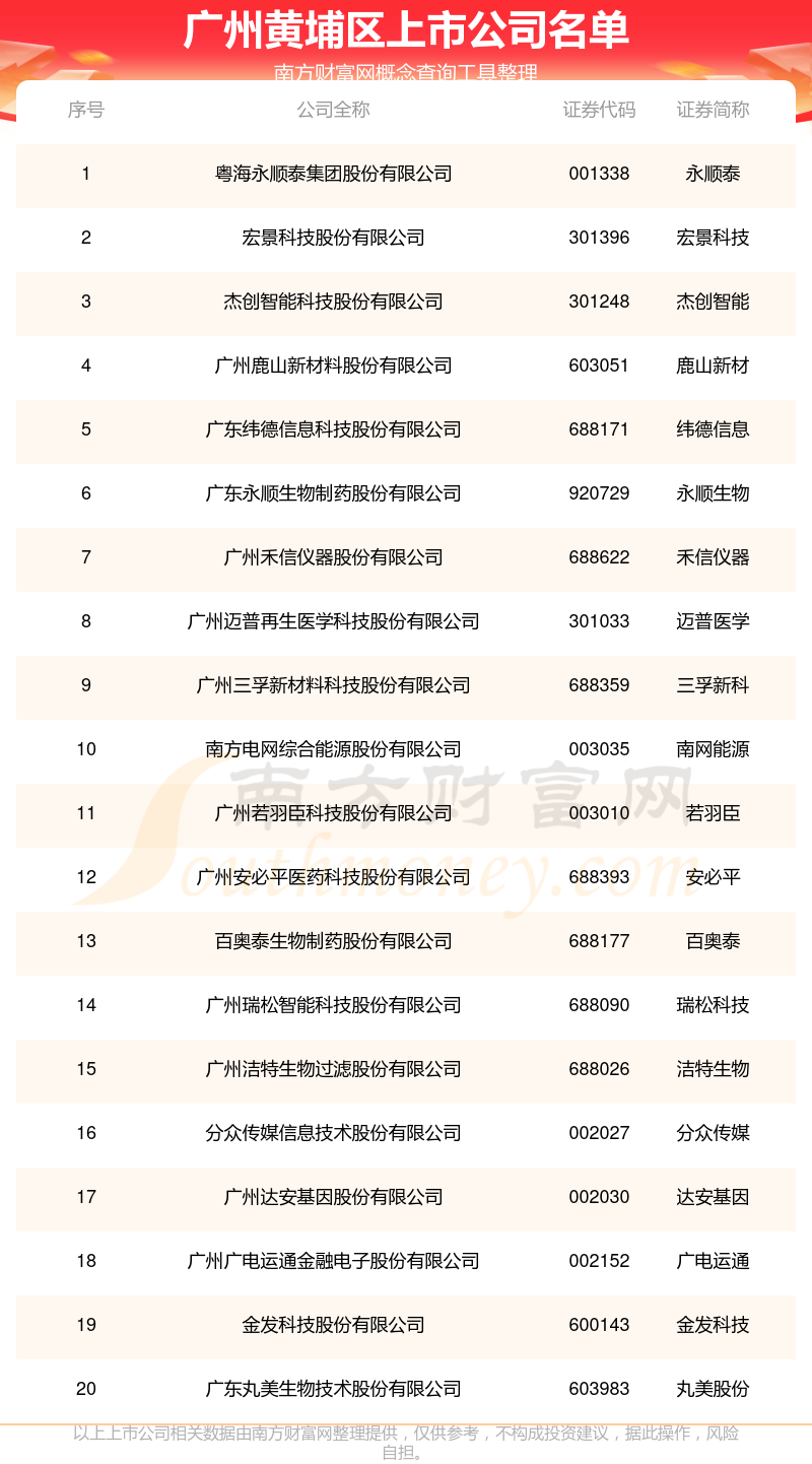 從數量來看,截至12月9日,廣州黃埔區(qū)共有50家A股上市公司。具體分布為上海證券交易所:南方航空、金發(fā)科技、宏昌電子、鹿山新材、原尚股份、好萊客、丸美生物、方邦股份、潔特生物、瑞松科技等15家,深圳證券交易所:穗恒運A、廣發(fā)證券、永順泰、分眾傳媒、達安基因、廣電運通、智光電氣、達意隆、毅昌科技、海格通信等34家,北京證券交易所:永順生物1家。