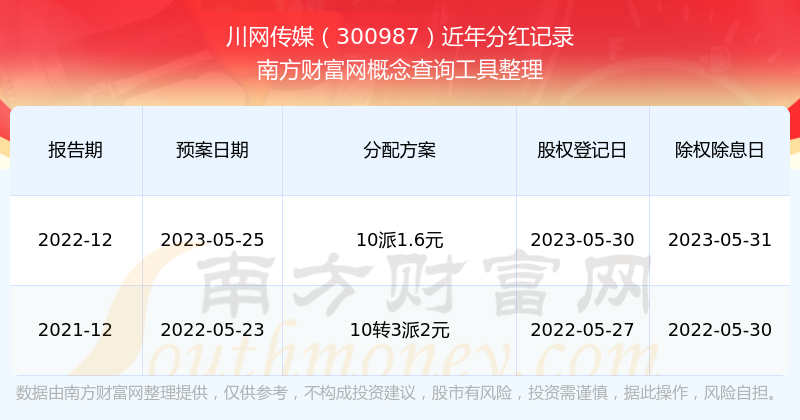 川網傳媒最新一次公布的分紅方案為10派1.6元。本次權益分派股權登記日為2023年5月30日,除權除息日為2023年5月31日,派息日為2023年5月31日。