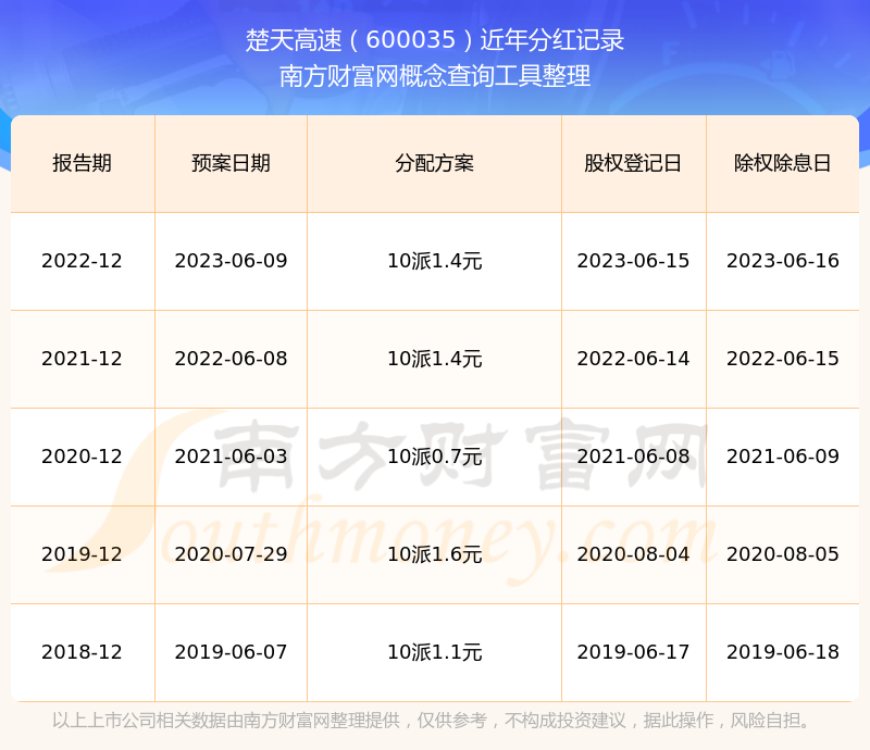近年楚天高速分紅情況如下表所示: