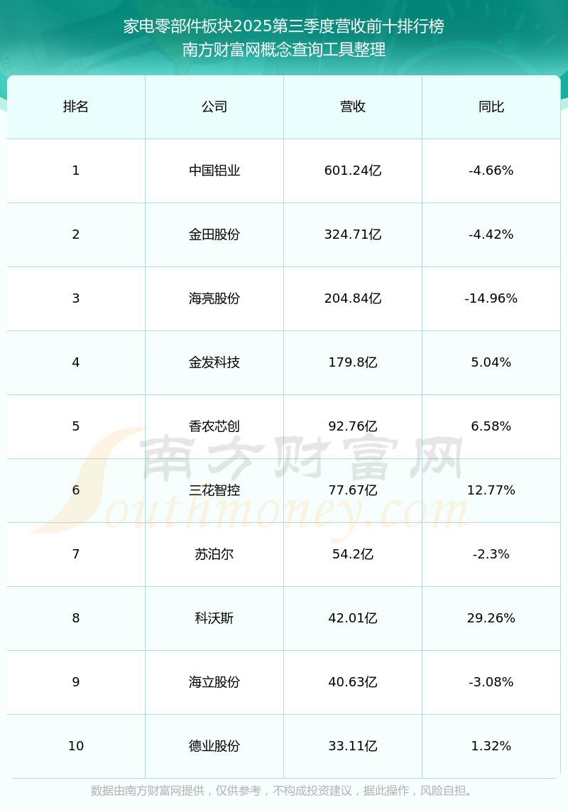 按照南方財富網概念查詢工具統計,該股所屬板塊為家電零部件板塊,該板塊共有41只股票,奇精機械2025第三季度營收在該板塊中排名為第28名,該板塊2025第三季度營收排名前十的股票如下表: