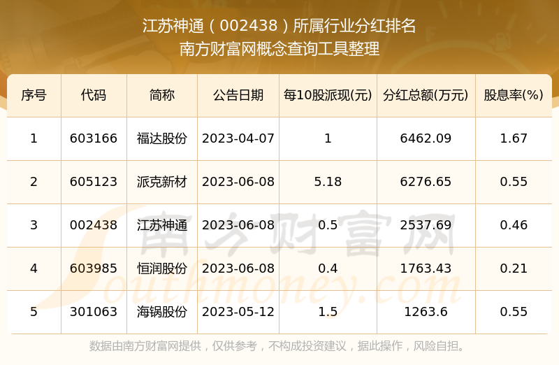 按照南方財富網趨勢選股系統統計,江蘇神通所屬行業為法蘭行業,法蘭行業分紅排名情況如下表: