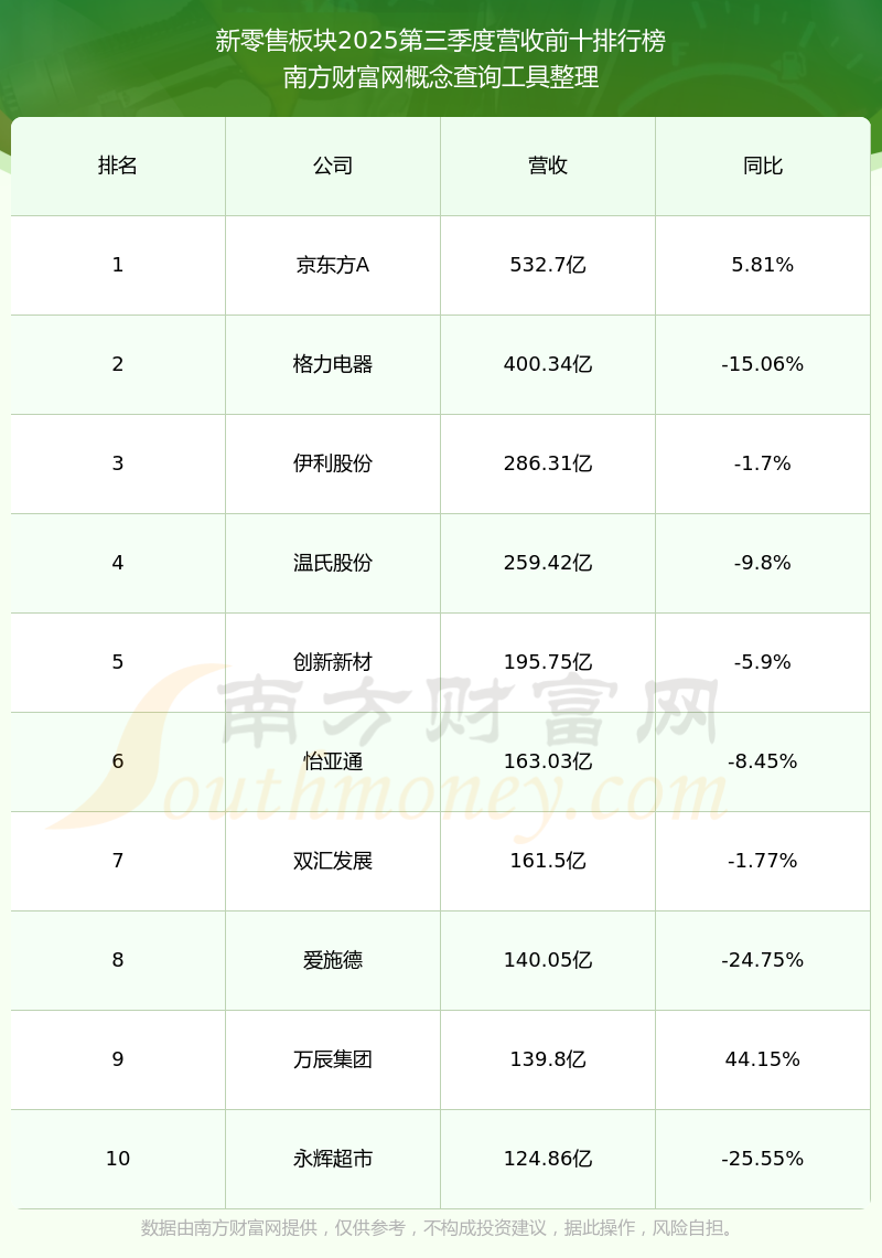 按照南方財富網(wǎng)概念查詢工具統(tǒng)計,該股所屬板塊為新零售板塊,該板塊共有207只股票,家家悅2025第三季度營收在該板塊中排名為第25名,該板塊2025第三季度營收排名前十的股票如下表:
