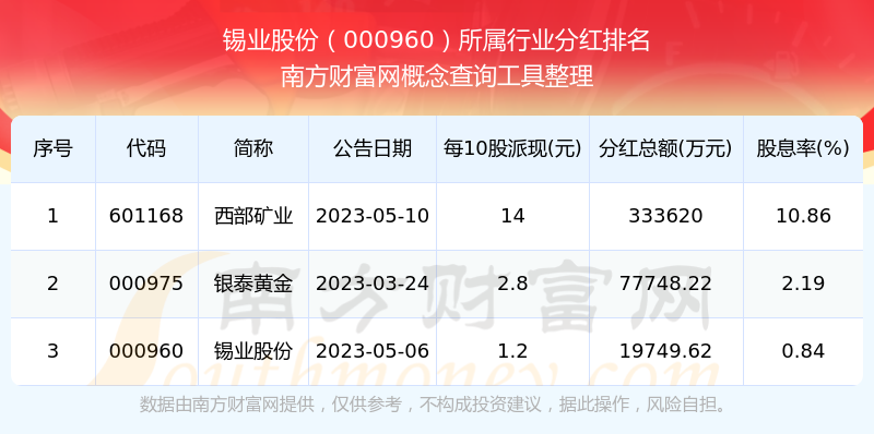 按照南方財富網趨勢選股系統統計,錫業股份所屬行業為銅行業,銅行業分紅排名情況如下表:
