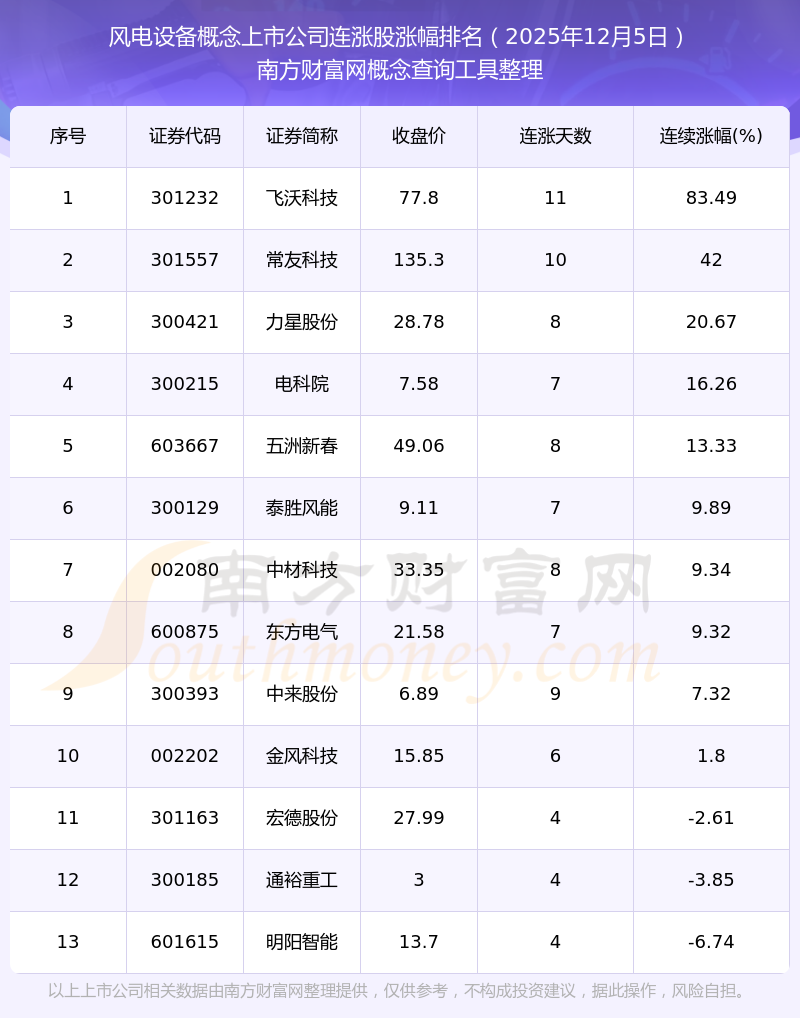 根據南方財富網概念查詢工具數據統計,截止2025年12月5日收盤,風電設備概念上市公司共有13只個股實現連漲。其中連續漲幅較大的個股有飛沃科技、常友科技、力星股份等,連續漲幅分別為83.49%、42.00%、20.67%。