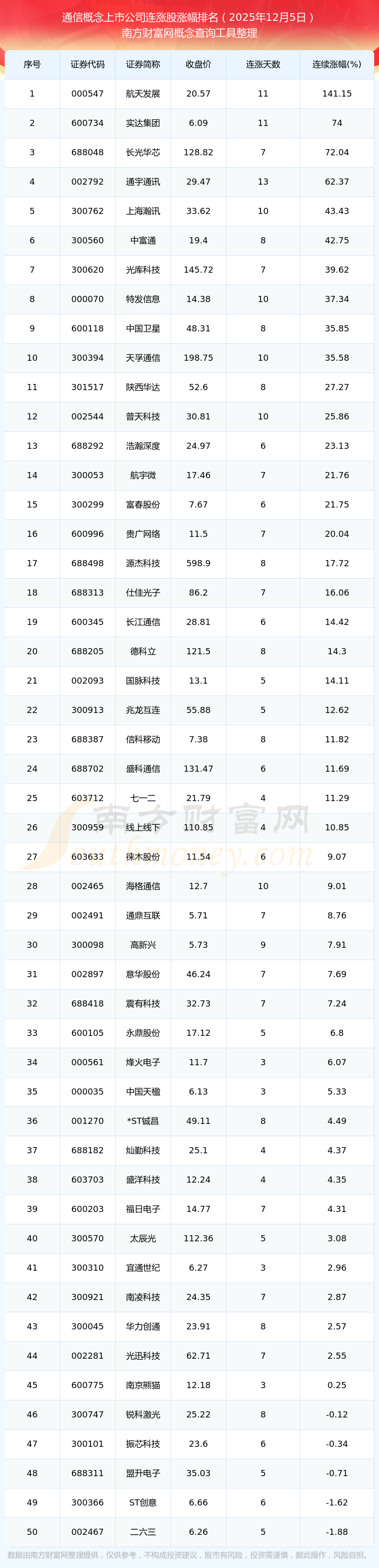 根據南方財富網概念查詢工具數據統計,截止2025年12月5日收盤,通信概念上市公司共有60只個股實現連漲。其中連續漲幅較大的個股有航天發展、實達集團、長光華芯等,連續漲幅分別為141.15%、74.00%、72.04%。