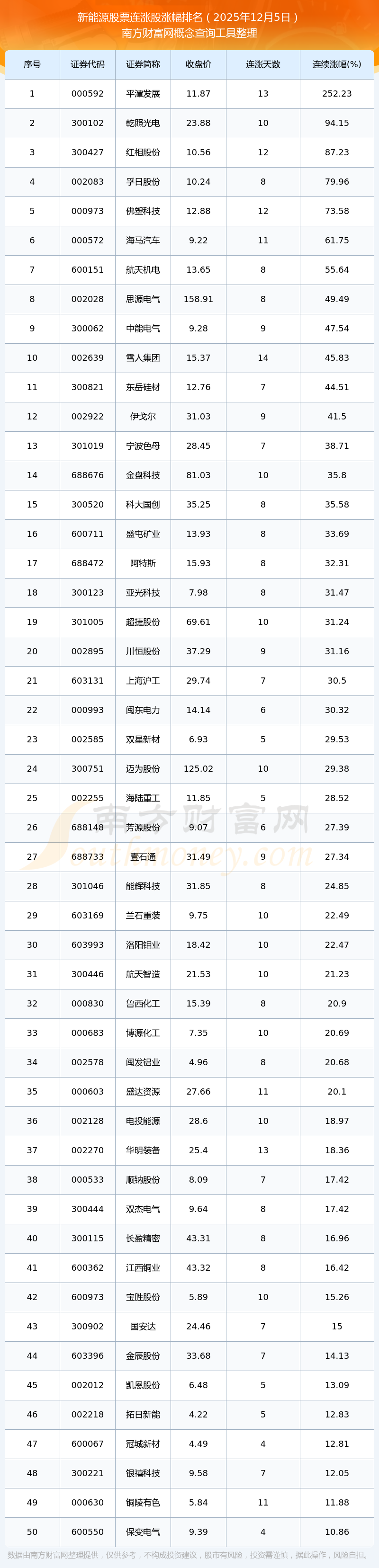2025年12月5日新能源股票共155只個股連漲:平潭發展連漲幅達252.23%