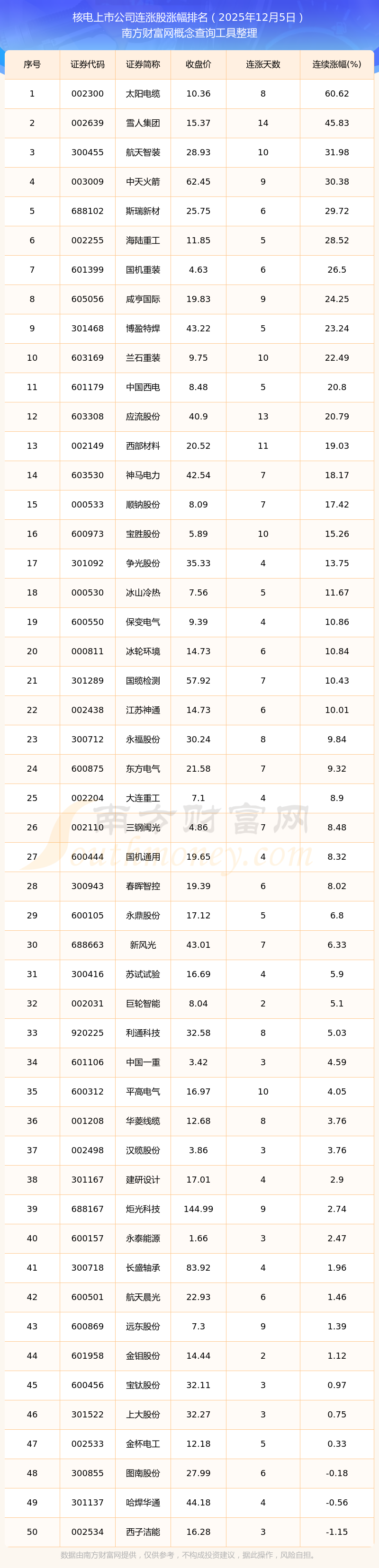 根據南方財富網概念查詢工具數據統計,截止2025年12月5日收盤,核電上市公司共有78只個股實現連漲。其中連續漲幅較大的個股有太陽電纜、雪人集團、航天智裝等,連續漲幅分別為60.62%、45.83%、31.98%。