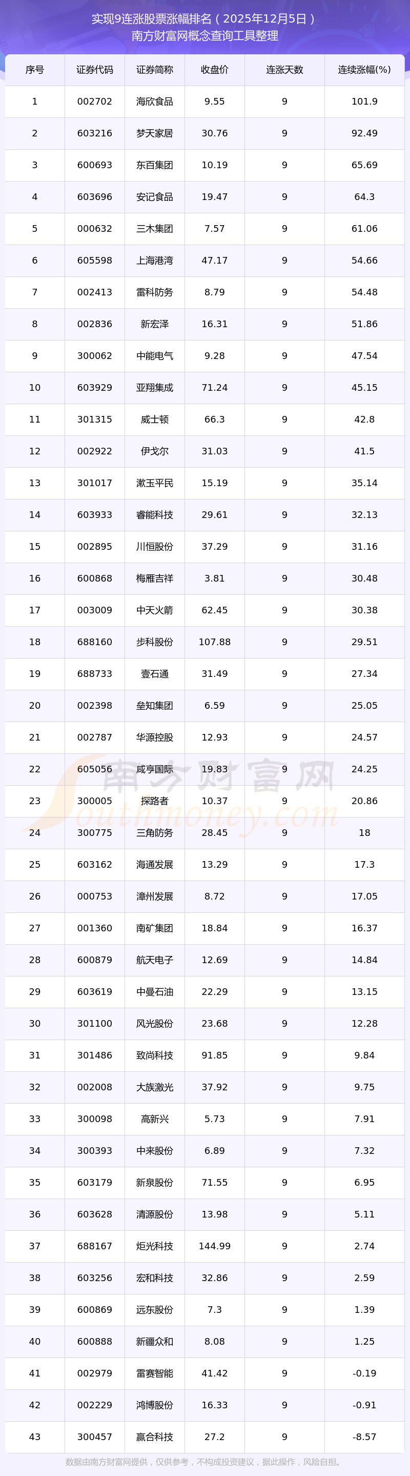 根據南方財富網概念查詢工具數據統計,截止2025年12月5日收盤,共有43只個股實現9天連漲。其中連續漲幅較大的個股有海欣食品、夢天家居、東百集團等,連續漲幅分別為101.90%、92.49%、65.69%。