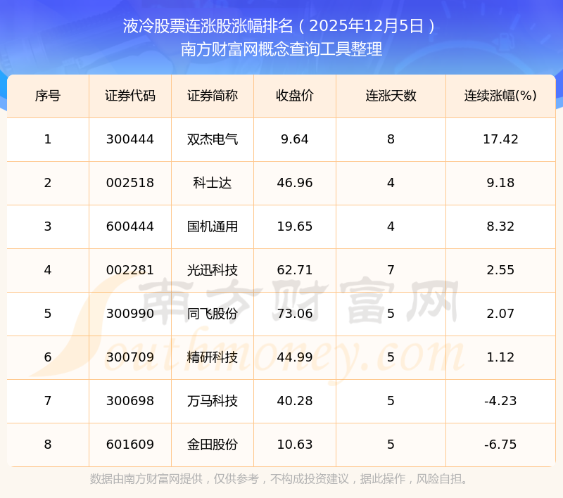 根據(jù)南方財富網(wǎng)概念查詢工具數(shù)據(jù)統(tǒng)計,截止2025年12月5日收盤,液冷股票共有8只個股實現(xiàn)連漲。其中連續(xù)漲幅較大的個股有雙杰電氣、科士達、國機通用等,連續(xù)漲幅分別為17.42%、9.18%、8.32%。