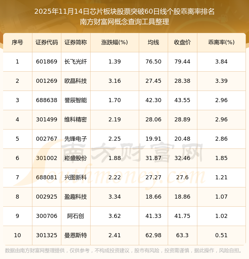 根據南方財富網概念查詢工具數據統計,截止2025年11月14日收盤,芯片板塊股票共有12只個股收盤價向上突破了60日線。其中乖離率較大的個股有長飛光纖、歐晶科技、譽辰智能等,乖離率分別為3.84%、3.39%、2.96%。
