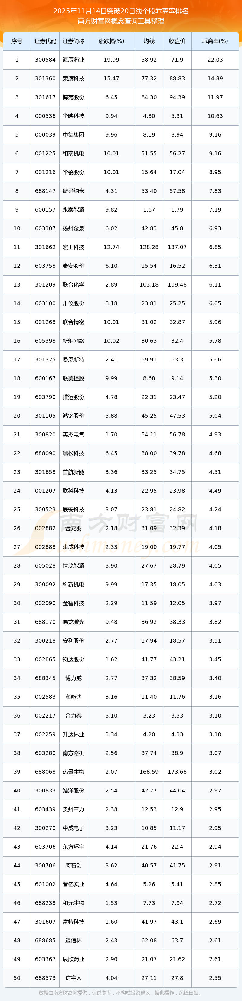 2025年11月14日突破20日線個(gè)股乖離率排名