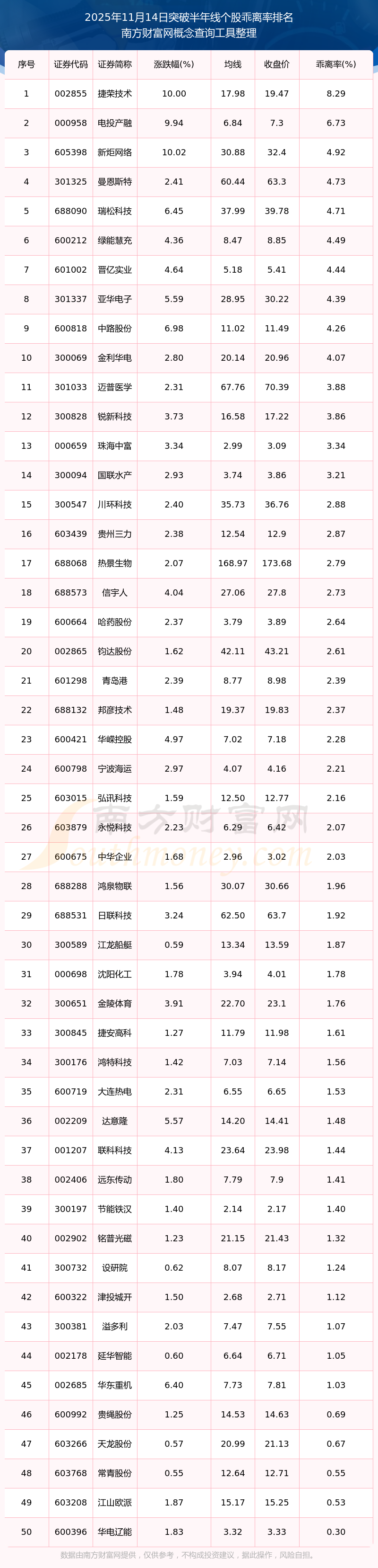 根據南方財富網概念查詢工具數據統計,截止2025年11月14日收盤,共有56只個股收盤價向上突破了120日線,其中乖離率較大的個股有捷榮技術、電投產融、新炬網絡、曼恩斯特、瑞松科技等,乖離率分別為8.29%、6.73%、4.92%、4.73%、4.71%。