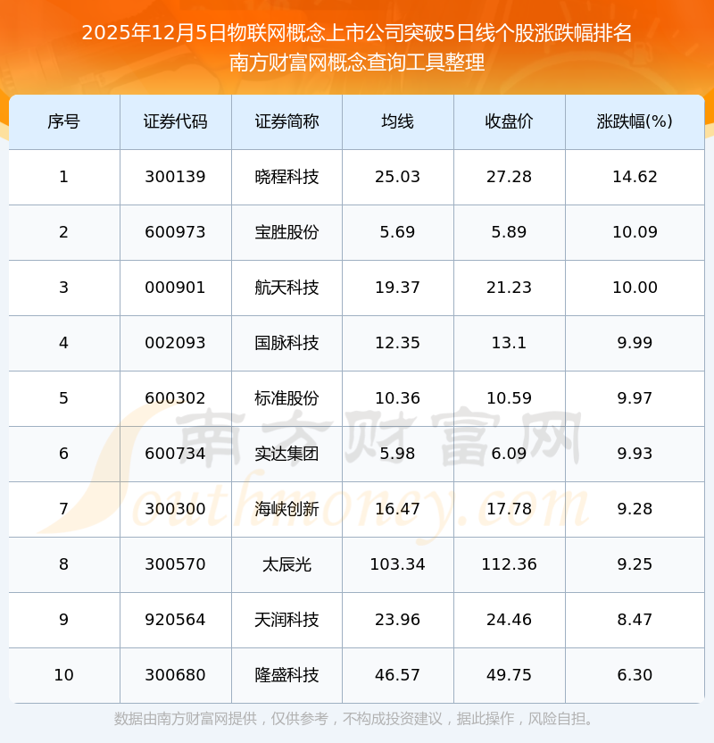 根據南方財富網概念查詢工具數據統計,截止2025年12月5日收盤,物聯網概念上市公司共有33只個股收盤價向上突破了5日線。其中漲幅較大的個股有曉程科技、寶勝股份、航天科技等,漲幅分別為14.62%、10.09%、10.00%。