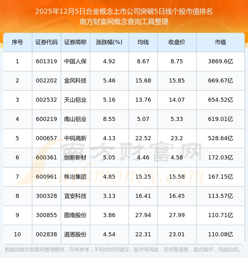 根據南方財富網概念查詢工具數據統計,截止2025年12月5日收盤,合金概念上市公司共有15只個股收盤價向上突破了5日線。其中市值較大的個股有中國人保、金風科技、天山鋁業等,市值分別為3869.6億、669.67億、654.52億。
