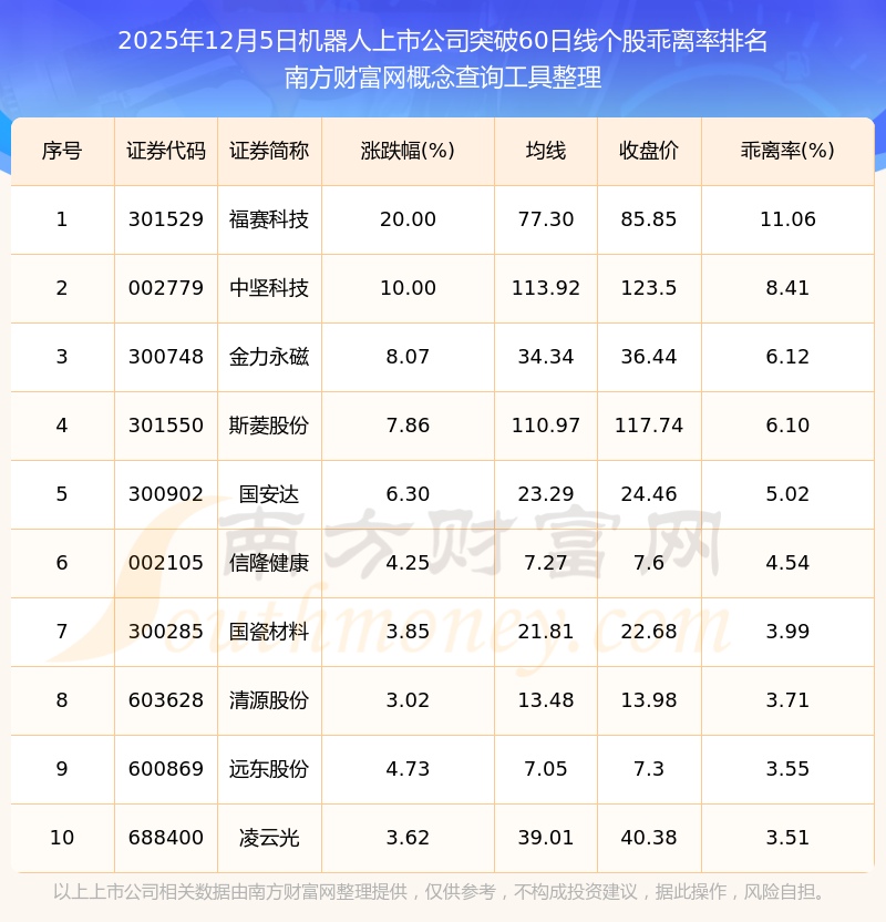根據南方財富網概念查詢工具數據統計,截止2025年12月5日收盤,機器人上市公司共有24只個股收盤價向上突破了60日線。其中乖離率較大的個股有福賽科技、中堅科技、金力永磁等,乖離率分別為11.06%、8.41%、6.12%。