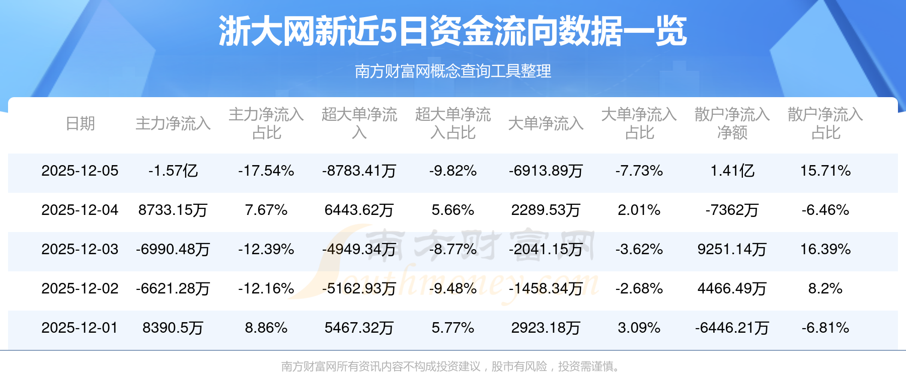 12月5日消息,浙大網新資金凈流出1.57億元,超大單資金凈流出8783.41萬元,換手率8.21%,成交金額8.95億元。