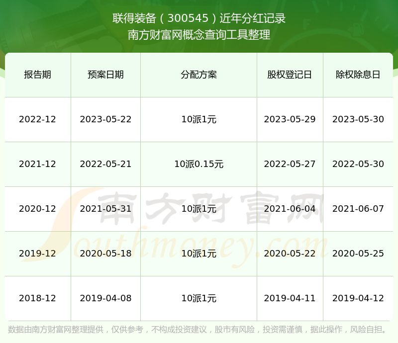 聯得裝備最新一次公布的分紅方案為10派1元。本次權益分派股權登記日為2023年5月29日,除權除息日為2023年5月30日,派息日為2023年5月30日。