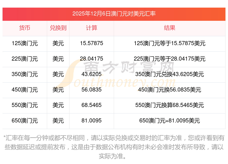 2025年12月6日匯率行情:41澳門元對美元匯率多少