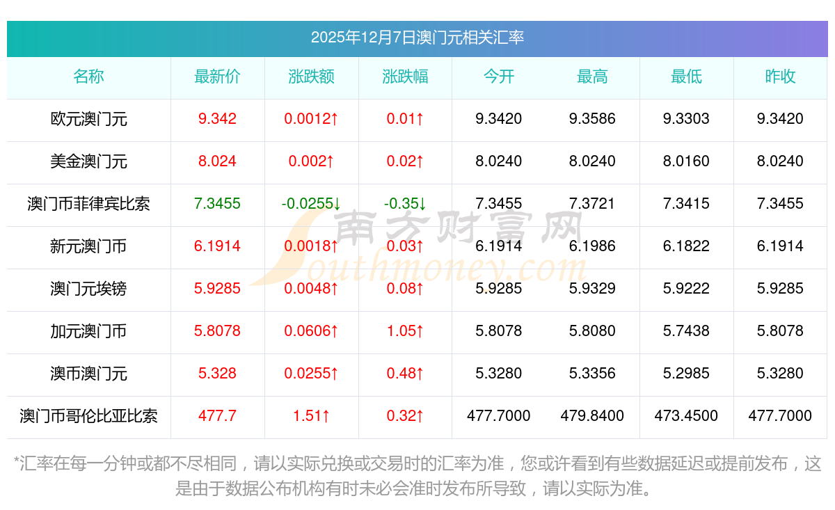 2025年12月7日澳門元相關匯率查詢
