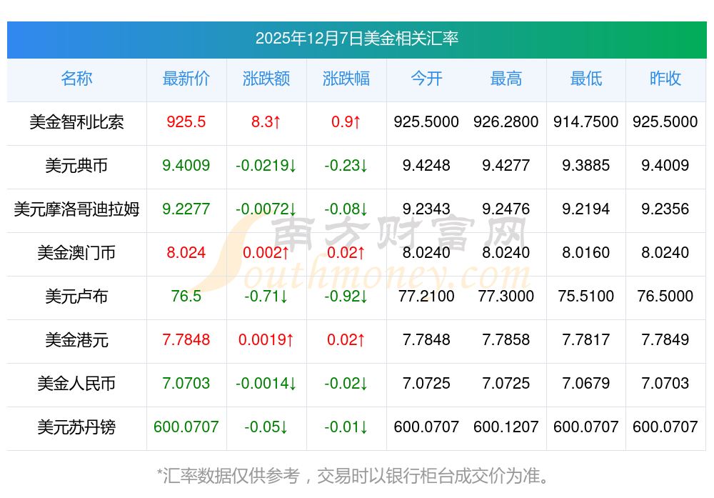 根據2025年12月7日匯率計算,USD兌換UYU匯率最新價39.070000,今開價39.0700,昨收價39.0700,最高價39.1200,最低價39.0700。