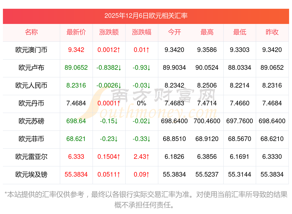 2025年12月6日歐元兌換墨西哥比索最新匯率:21.159100,今開:21.2468,昨收:21.1591,最高:21.2585,最低:21.1457。