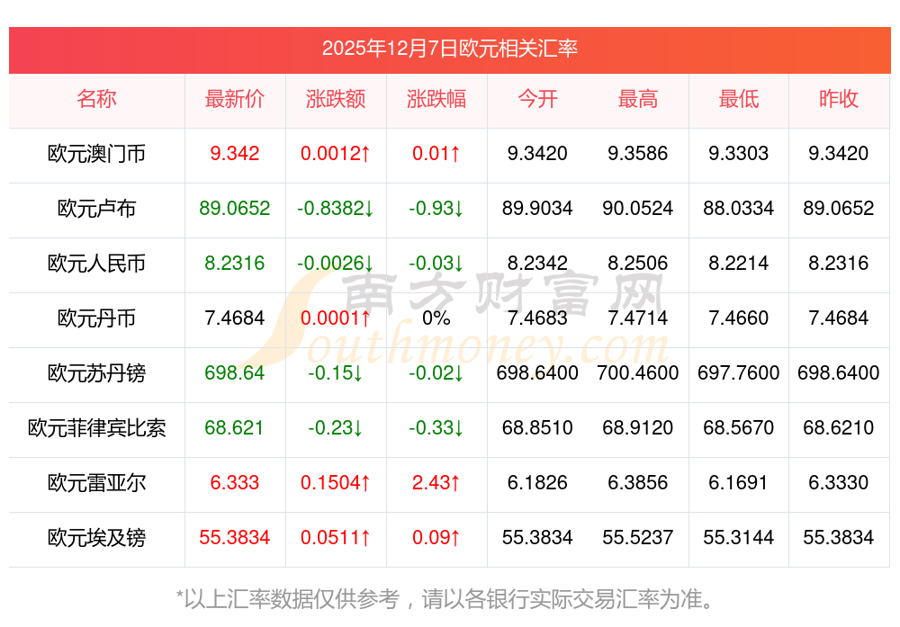 2025年12月7日最新消息,歐元兌換挪幣最新匯率為11.768700,今開為11.7687,昨收為11.7687,最高為11.7871,最低為11.7420。