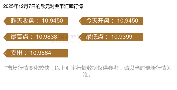 2025年12月7日歐元兌換典幣匯率是:10.945
