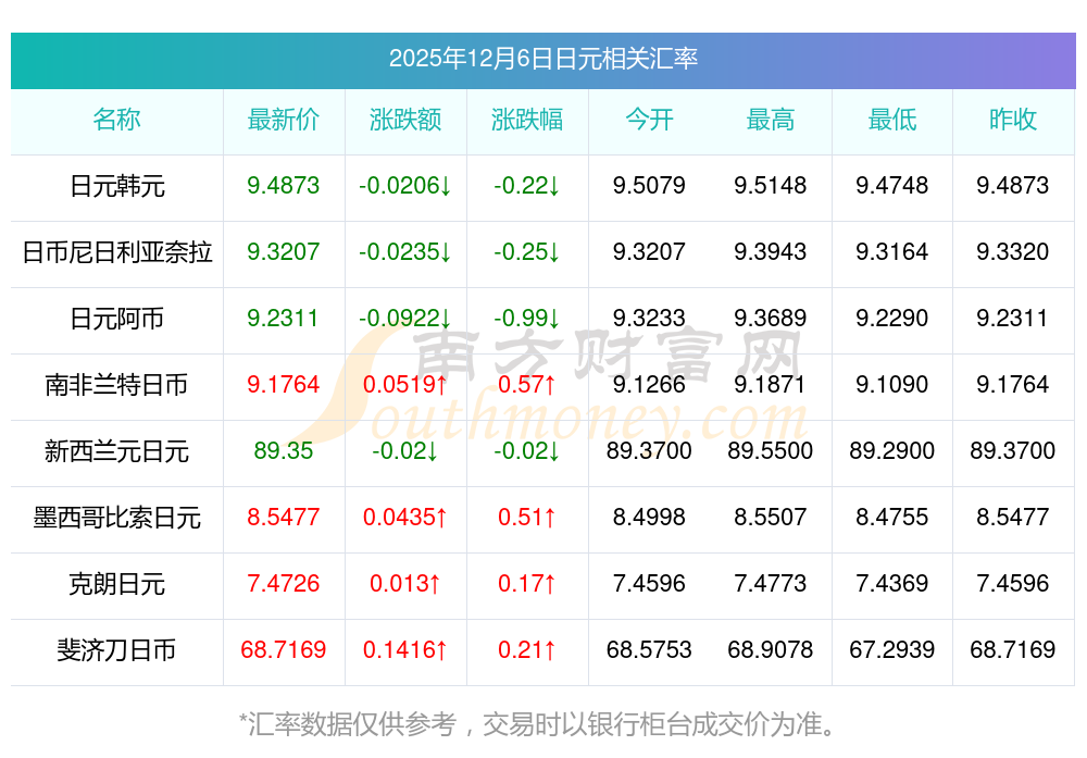 根據(jù)2025年12月6日匯率,日元兌換斐濟(jì)幣匯率最新0.014555,今開0.0145,昨收0.0146,最高0.0149,最低0.0145。