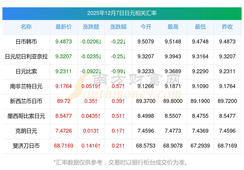 2025年12月7日日元相關(guān)匯率查詢