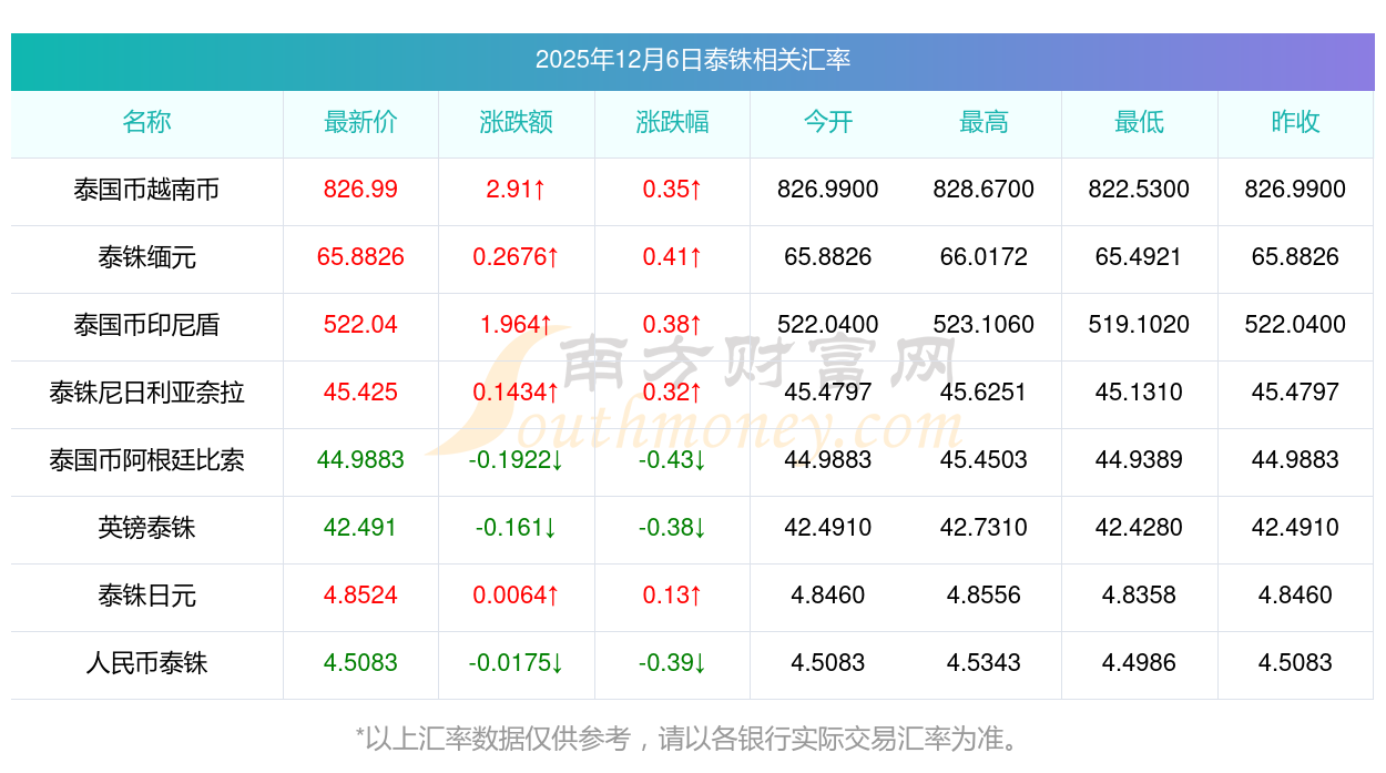 根據(jù)2025年12月6日匯率,泰銖兌換新西蘭幣匯率最新0.054320,今開0.0543,昨收0.0543,最高0.0544,最低0.0541。