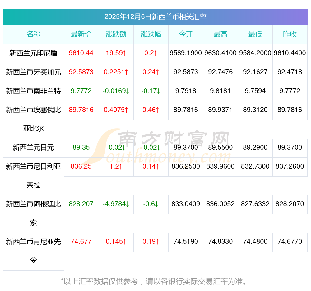 2025年12月6日最新消息,新西蘭幣兌換土比索最新匯率為13.861200,今開為13.8264,昨收為13.8612,最高為13.8900,最低為13.8192。