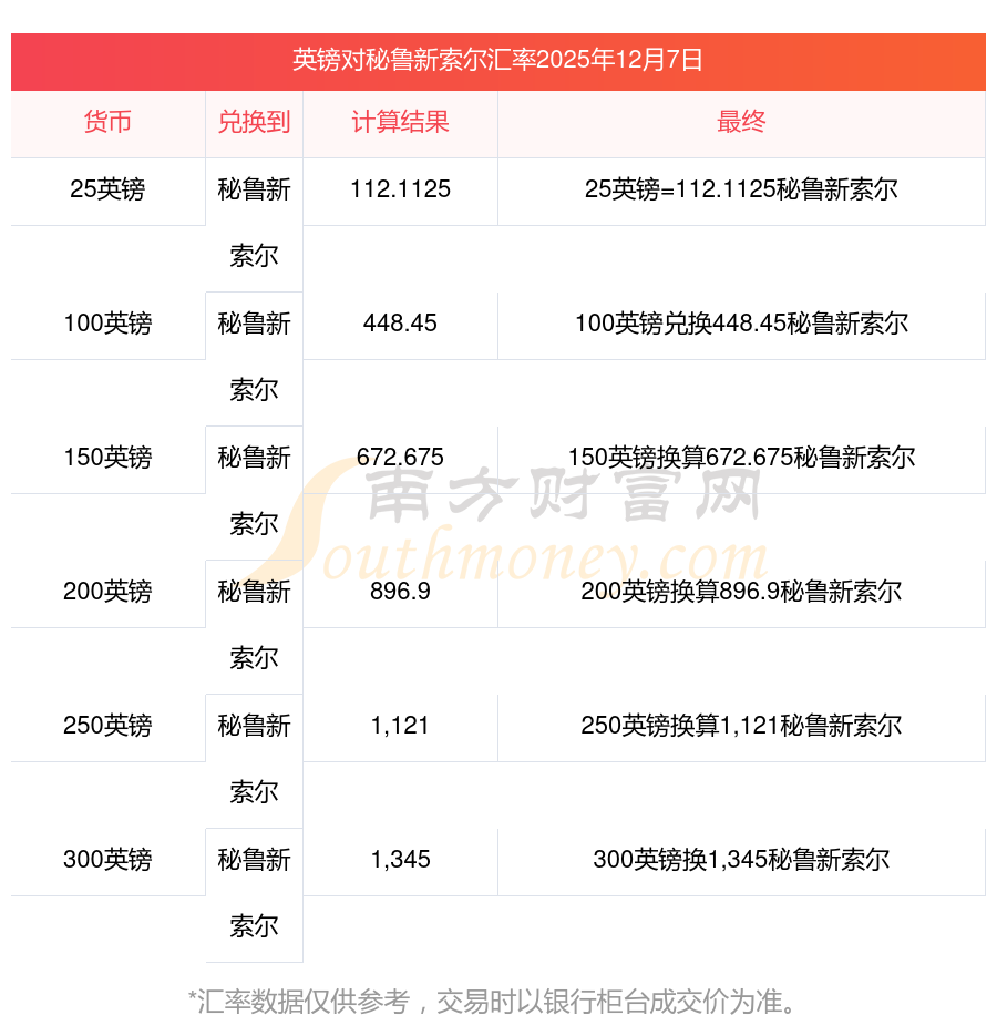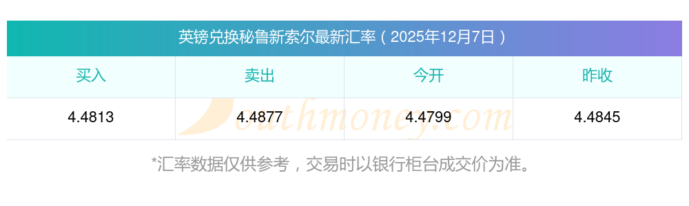 今日英鎊兌換秘魯新索爾價位表一覽(2025年12月7日)