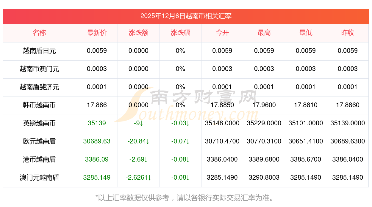 2025年12月6日越南幣相關匯率查詢