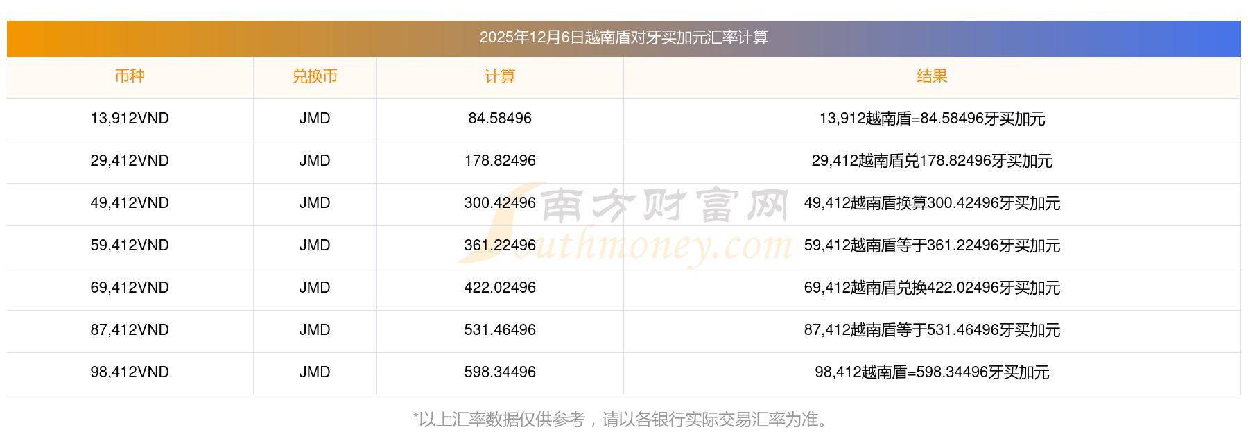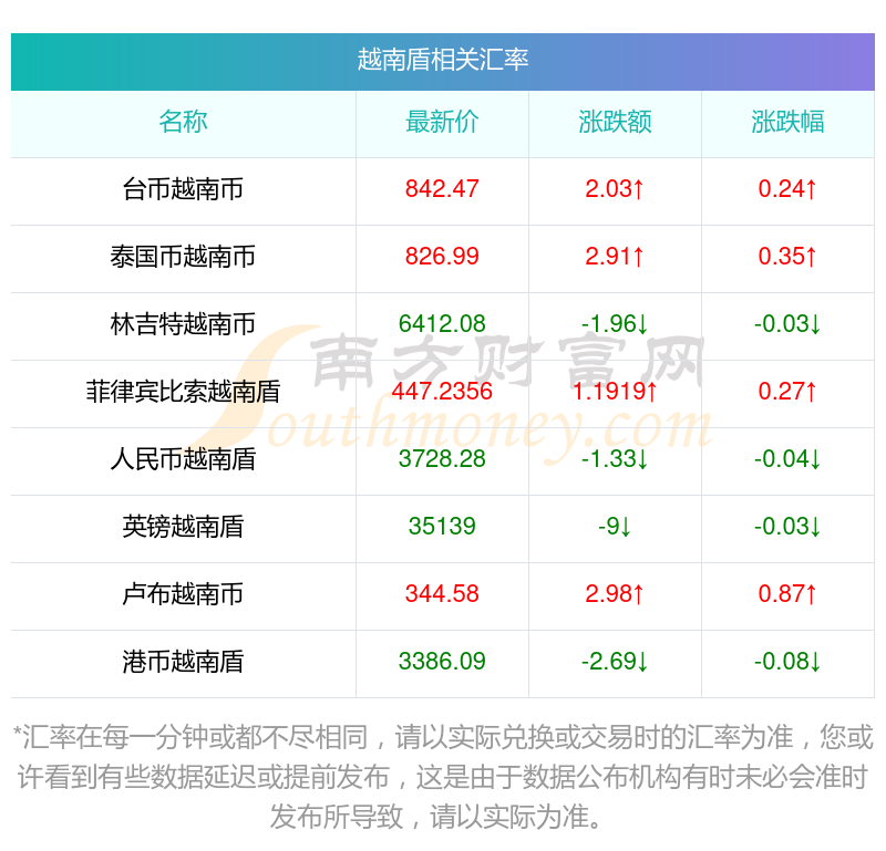 南方財富網為您提供越南盾對牙買加元匯率最新價格詳情。