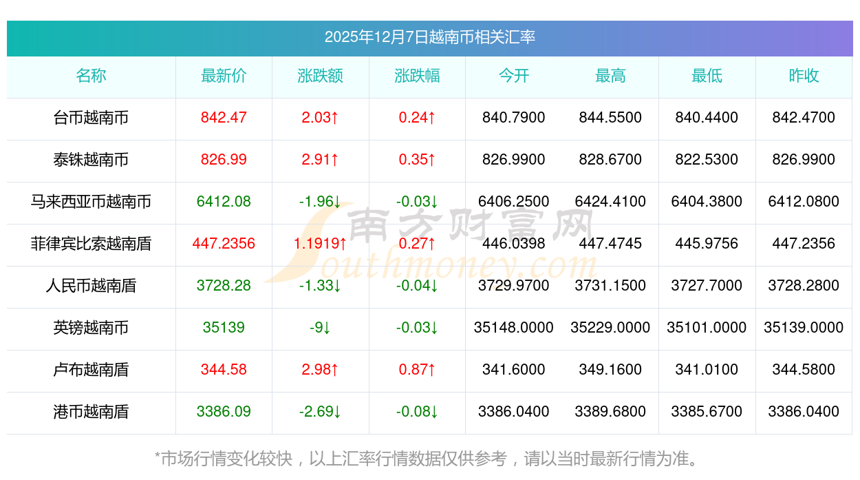 根據(jù)2025年12月7日匯率,越南幣兌換瑞郎匯率最新價(jià)0.000031,今開(kāi)價(jià)0.0000,昨收價(jià)0.0000,最高價(jià)0.0000,最低價(jià)0.0000。