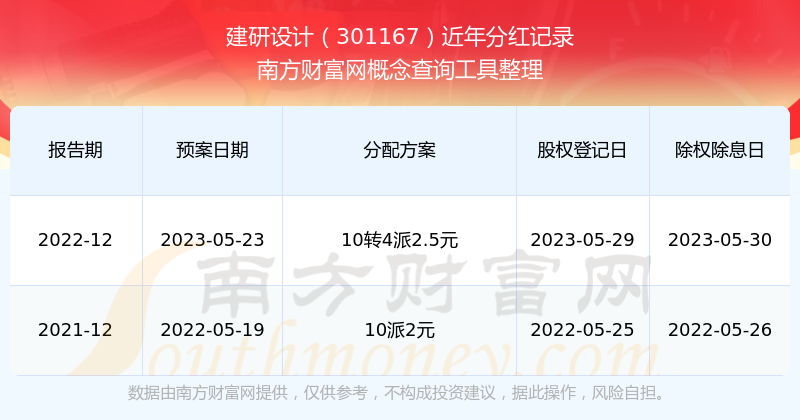 建研設計最新一次公布的分紅方案為10轉4派2.5元。本次權益分派股權登記日為2023年5月29日,除權除息日為2023年5月30日,派息日為2023年5月30日。