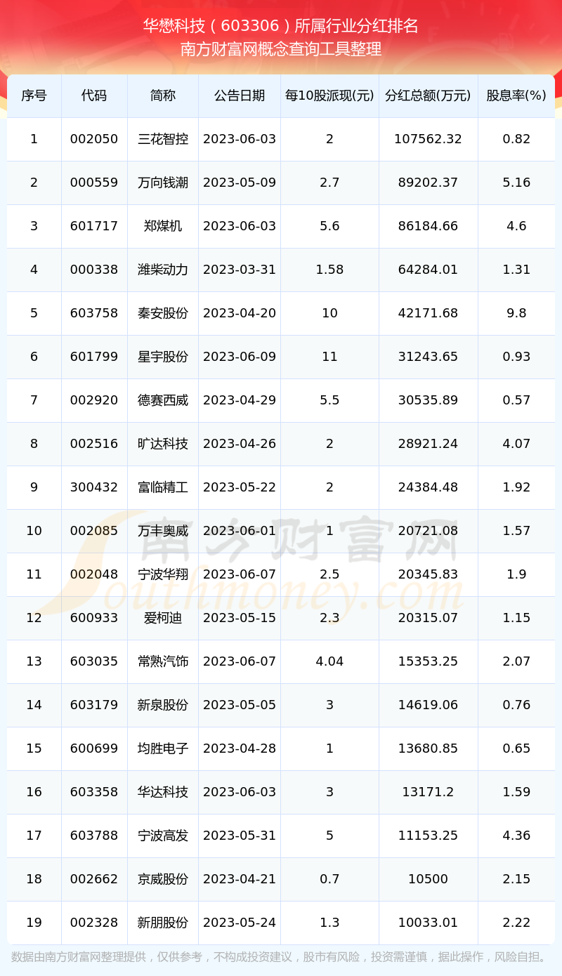按照南方財富網趨勢選股系統統計,華懋科技所屬行業為汽車零部件行業,汽車零部件行業分紅排名情況如下表: