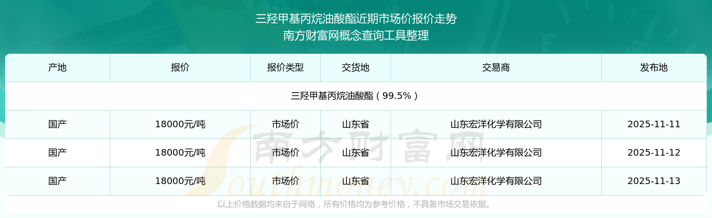 2025年11月13日,山東宏洋化學有限公司三羥甲基丙烷油酸酯(99.5%),國產,交易地點為山東省,市場價報價為18000.00元/噸。