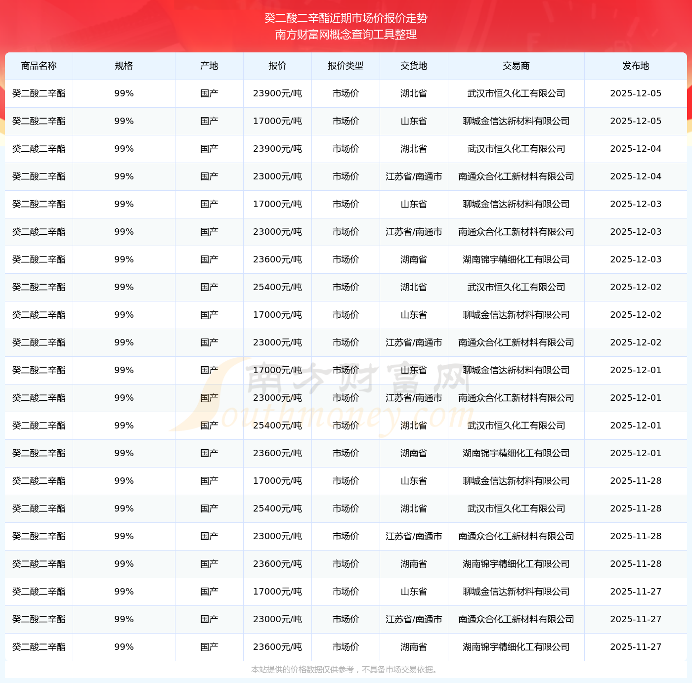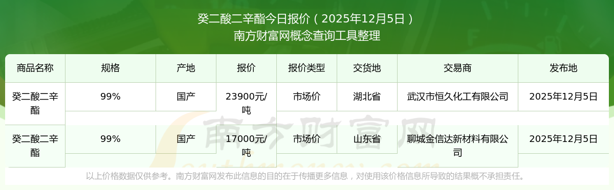 2025年12月5日,武漢市恒久化工有限公司癸二酸二辛酯(99%),國產,交易地點為湖北省,市場價報價為23900.00元/噸。